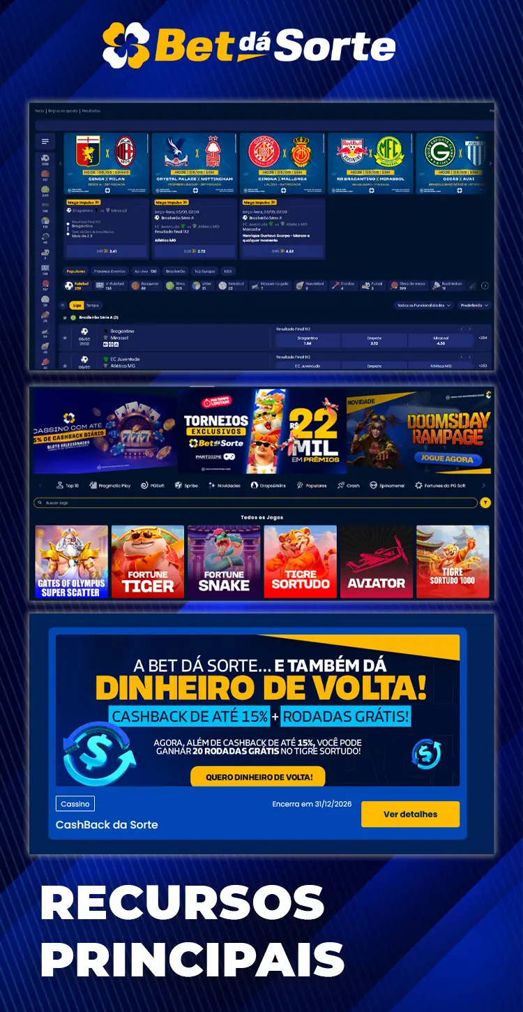 Na Bet dá Sorte, nos empenhamos para oferecer uma experiência completa, tanto em apostas esportivas quanto em jogos de cassino. Confira os principais recursos da Bet dá Sorte: